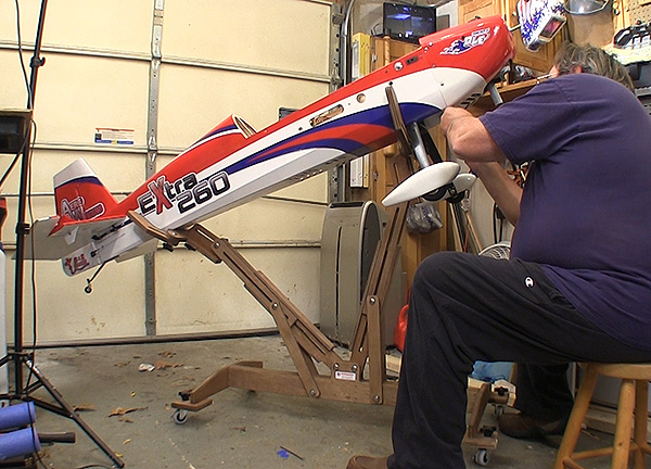 Последним постарался бы промерить установочный угол обоих консолей по корневой нервюре. Вдруг еще и здесь вкралась кривизна? Почти так же. Фюзеляж на стол. Подкладываем под зад нужной высоты чепик. Ставим разметку одного крыла в горизонт (по отверстиям крепежных болтов, стопорам). Затем проверяем горизонтальность разметки другого крыла.