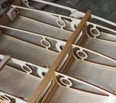 Боковина - склейка двух 3мм пластин. Материал - тополевая фанера. А полушпангоуты и пластина крепления ног - березовая фанера 3 мм.