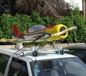 Питс это мой второй большой биплан, у меня еще есть Престо размах 1800мм (фотка прилогается). Так вот у папика запорожец физиески модель влазит но тогда очень тесно внутри, мы сделали из ДВП и сосновых палок так сказать гробик-коробок под крылья с крепежом к богажнику а сам фюз крепим за шасси эспандерами к коробку вот так и ездим.