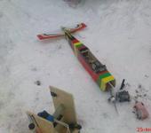 Вот уронил сегодня моего Зксплорера,стал сажать ,посадил,и чуть ткнувшись в снег передняя стойка выломалась вместе с мотошпангоутом,хотя колёса большие,и ничуть не помогли, 89 мм. ДА просто, китайская фанера что наши вафли да ещё и клея просто нету, соплями они чтоль клеили.Взлетел с сломанной стойкой.полетал вдоволь .сел,совсем отвалилась,летать хочется,поставил поплавки от КАльмато чтоб по снегу скользить, и ,без опыта попытался взлететь, не неудалось,и со страшным креном как мельница я закувыркался по планете,благодаря полному отсутвию клея мотошпангоут просто отвалился вместе с мотором и баком,руль высоты отломался вместе с килем