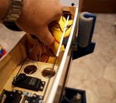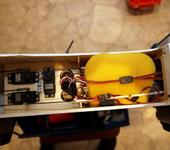 - приемник и бортовое питание обмотал в специальный мягкий материал (купил на башне докучи…), засунул, как показано по схеме под боудены тяг газа и рулевого колеса. после цнтровки самолета нужно будет как-то закрепить. Не соображу, как лучше… подскажите, кто как крепит. Думал сделать по месту специальные отсеки из пенопласта, а на крыло наклеить брусочки из того же пенопласта, чтобы в собраном состоянии располагались между боуденами и поджимали приемник с бортом кверху.