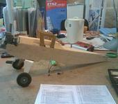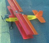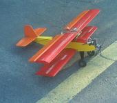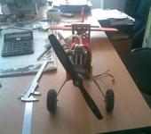 сегодня наконец облетал,и даже проверил на прочность,центровка на чертеже для меня задняя после того как сделал 3см от передней кромки верхнего крыла полетел как положено,летает пешком в треть газа,но если газонуть то может и быстро,первый раз взлетел с задней центровкой,на развороте сорвало в штопор,так метров с десяти и впечатал,результат сломанный винт,сработали резинки все осталось целым,на днях выеду на полетушки с камерой выкину видео и попробую с лентой полетать,вообшем моделью очень доволен,нравиться работа четырех тактника,прикольно урчит,но танет даже на холостых.