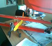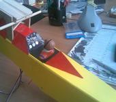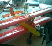 приклеиваем переднюю и заднюю кромку на крылья,потом шкурим и обтягиваем обыкновенным цветным скотчем,в моем случае красным,ставим апаратуру и собираем биплан,ну вот в кратце и все ждем погоды для облета,
