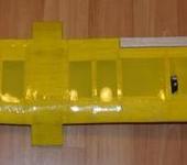 Вобщем обклеил крыло лавсаном купленым на рынке, все получилось без проблем. Есть конечно несколько мелких косяков, но их еще подправлю. Законцовки и труднодоступные места заклеил скотчем, купил такого же желтого цвета.