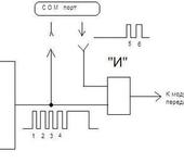 Мониторить из софта можно сигналы DSR или CTS COM порта. Но вот делать что-либо “вовремя” с требуемой точностью так вряд ли получится, по-моему. Вот если элемент “И” на схеме заменить микроконтроллером, к-рый будет разбирать входной РРМ, получать из СОМ числовые данные доп. каналов (асинхронно) и вставлять их в выход - это вполне реальная задача. (Соответственно, связь со входом СОМ из схемы убрать)