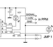 Питание контроллера происходит непосредственно от цепи питания приемника, поэтому разрешается использовать питание приемника не более 5.5В. Для использования устройства с питанием приемника 6В можно добавить в цепь питания контроллера последовательно два кремневых диода.
