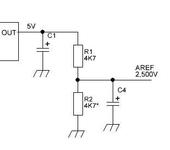 Ниже схема. Резисторы нужно подобрать очень точно, так что бы на выходе было 2,500В. Любым резисотром подбирай это напряжение. Подобрирать всё ровно придётся, т.к. стабилизатор даёт не точно 5В. По этому если взять 1% сопротивления и оба одинаковые то на выходе не будет такой точности как хотелось бы. По этому резисторы нужно по подбирать. Взять штук 20 5%-10% и их по подбирать.