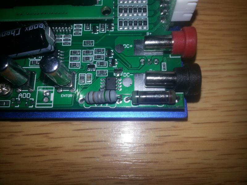 - Внизу, справа, между разъемами +/-, просто капля припоя (на фото судя по всему резюк). Попробовал её убрать - оказалось там должна быть деталька отвечающая за проверку полярности батареи.
