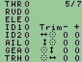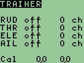 При помощи этого экрана вы можете откалибровать все четыре аналоговых входных сигнала от ручек управления. Процедура калибровки занимает четыре шага и требует перемещения ручек управления, затем придерживания их в нужном положение и перемещения курсора вниз при неизменном положении ручки управления.