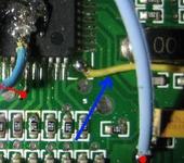 Внимание! В зависимости от типа инвертора он должен запитываться от 5В или же другим напряжением. Тем не менее, схема подключения полярного транзистора остается такой же. На фото показано место соединения полярного транзистора с PB7 (желтый провод, синие стрелки).