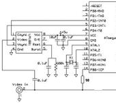 - Из нескольких статей Ричарда решил сделать по алгоритму как у него описано, только не создание видео с ноля, а видео оверлей через Lm1881. Полный контроль над выводом, все то что мне нужно, можно замоделить несколько аппаратных градаций черно-белого изображения. Но как раз по данному алгоритму получаются полные грабли. Схема, код и результат ниже. Прерывание работает некорректно, отсчет строк ползет, возможно код в прерывании долго отрабатывает. Теоретически все должно работать, практически полный абзац.