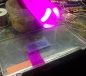 Засвечиваем фотошаблон. Фотошаблон для моего резиста - негативный, т.е. засвеченный ультрафиолетом участки не смоются. Засветка производилась УФ лампой 26Вт, из ближайшего магазина светотехники.