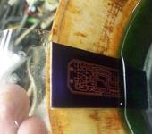 - Мне нравится лепить фоторезист на фольгу под водой. Опусти в в тазик с КИПЯЧЕНОЙ (в ней меньше растворенного воздуха; на плате не возникают воздушные пузырьки!) сильно теплой водой плату, прямо под поверхностью воды отделяю подложку, прикладываю слегка к плате. Если прикладывание делается под водой, то фоторезист можно повозить по плате и спозиционировать как надо. Если на воздухе - уже не подвинешь. С одного края фоторезист плотно приглаживаю пальцами - чтобы уже не перекосился и не сдвинулся.