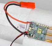 Плата установлена на основание из пенопласта под небольшим углом, чтобы тяги не задевали шестерни серво-машинок.В качестве регулятора я использовал дорогой чешский, т.к. он имеет BEC на 3,7 Вольта.