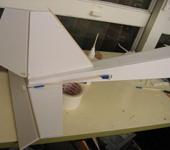 сделал хвостовое оперение, осталось повесить тяги и придумать костыль. с петлями не стал заморачиваться, просто повесил рули на широкий прозрачный скотч.