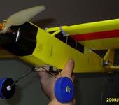 После первого полета 04.04.09 когда воткнулся метров с 15 в планету пришлось сделать новый контейнер а черного скотча под рукой не было потому и покраснел носярник а шасси на резинках пока летаю без них отрабатываю технику захода на посадку т.к. в переди даст бог предстоит летать на более тяжелом самолете а там без шасси никак все таки вес около 1.7 кг будет.