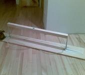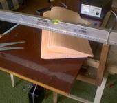 Для того чтобы резать детали фюзеляжа, нить натянул вертикально при помощи груза (аккумулятор от UPSа - 2.5кг). В качестве балки использовал строительный метр, в столешнице просверлил отверстие, пропустил нить. Снизу к нити привязал крючек, согнутый из гвоздя (прям как рыболовный), на крючок повесил груз.