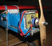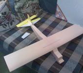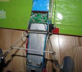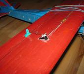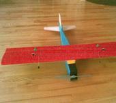 Оперение по размерам примерно как у Трикона, вырезано из листов гладкой потолочки. На торцы оперения приклеены расщепленные вдоль бамбуковые шампуры (в сечении полукруг). Вклеил оперение. Сверху и снизу крыла приклеил ленты (стяжки от коробок бытовой техники). Вырезал элероны, сразу решил, что на каждый элерон пойдет по одной машинке, установленной на крыле по середине элерона. Это упростит крепление крыла к фюзеляжу (машинка не будет мешать) и жесткость элерона будет достаточной. По задней кромке крыла приклеил рейку, чтобы пенопласт не сминало резинками. По передней кромке - бамбуковые щепки. Центроплан оклеил сверху и снизу картоном от папки. По передней кромке крыла проклеил армированный скотч. Кыло обтянул желтым скотчем. С боков фюзеляжа в местах ложа крыла приклеил линейки, линейками с боков заклеил нишу аккумулятора. Для крепления резинок крыла просверлил отверстия и вклеил обрезки бамбуковых шампуров. В нише аккумулятора между боковин и к задней стенке вклеил на 5минутку деревянный брусок для крепления шасси. Шасси открутил от Трикона. Для зацепления резинок шасси сделал еще одни штырьки чуть позади передних. В случае удара шасси отгибается назад, резинки амортизируют удар. Крыло крепится 4мя резинками. 2-е крест-на-крест и две вдоль фюзеляжа. Рули и элероны навешаны на скотч (как на Триконе в шахматном порядке). Моторный шпангоут из 3мм фанеры от фруктовых ящиков, дополнительно приклеен армированным скотчем. Мотор на шурупах, под крестовину, под верхние и левые шурупы проложены шайбы для выкоса двигателя (вниз, вправо).