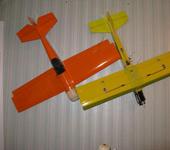 Спасибо что оценили! Из чертежей есть только то, что выложено в первом посте. Профиль взял от Simplex-а (посмотрите в ангаре у Concord-a, тут на сайте), могу только отсканировать жестянку- шаблон, если нужно. Вполне научился летать на этом аппарате, он прекрасно крутит бочки, петли получаются вялые, особенно обратная, но это думаю можно поправить, увеличив плечо на качалках. Аппаратура у меня простая - WFLY-06 с механическими триммерами, без настраиваемых микшеров (только стандартные), а желательно делать микс газа с РВ, при полном газу модель тащит вверх. Окраска получилась удачная, хорошо различается верх и низ на большом расстоянии. Моделька весьма крепкая, сколько морковок выдержала, винтов попереломал штук пять. Не очень красиво выглядят тяги снаружи и создают дополнительное сопротивление, но для тренера скорость и внешний вид не главное. Главную задачу ставил перед собой - сделать простую модель, чтобы просто было сделать, была крепкая, но достаточно легкая. Из потолочки клеить сложнее, когда делал облегченное крыло для Трикона (вырезал из цельного куска розового пенопласта, облагчил, потом обтягавал разрезанной потолокой - выигрыш был небольшой), поэтому решил, что из цельного куска резать проще, быстрее, без особого утяжеления.