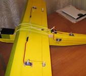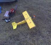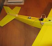 Оперение по размерам примерно как у Трикона, вырезано из листов гладкой потолочки. На торцы оперения приклеены расщепленные вдоль бамбуковые шампуры (в сечении полукруг). Вклеил оперение. Сверху и снизу крыла приклеил ленты (стяжки от коробок бытовой техники). Вырезал элероны, сразу решил, что на каждый элерон пойдет по одной машинке, установленной на крыле по середине элерона. Это упростит крепление крыла к фюзеляжу (машинка не будет мешать) и жесткость элерона будет достаточной. По задней кромке крыла приклеил рейку, чтобы пенопласт не сминало резинками. По передней кромке - бамбуковые щепки. Центроплан оклеил сверху и снизу картоном от папки. По передней кромке крыла проклеил армированный скотч. Кыло обтянул желтым скотчем. С боков фюзеляжа в местах ложа крыла приклеил линейки, линейками с боков заклеил нишу аккумулятора. Для крепления резинок крыла просверлил отверстия и вклеил обрезки бамбуковых шампуров. В нише аккумулятора между боковин и к задней стенке вклеил на 5минутку деревянный брусок для крепления шасси. Шасси открутил от Трикона. Для зацепления резинок шасси сделал еще одни штырьки чуть позади передних. В случае удара шасси отгибается назад, резинки амортизируют удар. Крыло крепится 4мя резинками. 2-е крест-на-крест и две вдоль фюзеляжа. Рули и элероны навешаны на скотч (как на Триконе в шахматном порядке). Моторный шпангоут из 3мм фанеры от фруктовых ящиков, дополнительно приклеен армированным скотчем. Мотор на шурупах, под крестовину, под верхние и левые шурупы проложены шайбы для выкоса двигателя (вниз, вправо).