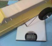 Для того чтобы резать детали фюзеляжа, нить натянул вертикально при помощи груза (аккумулятор от UPSа - 2.5кг). В качестве балки использовал строительный метр, в столешнице просверлил отверстие, пропустил нить. Снизу к нити привязал крючек, согнутый из гвоздя (прям как рыболовный), на крючок повесил груз.