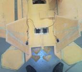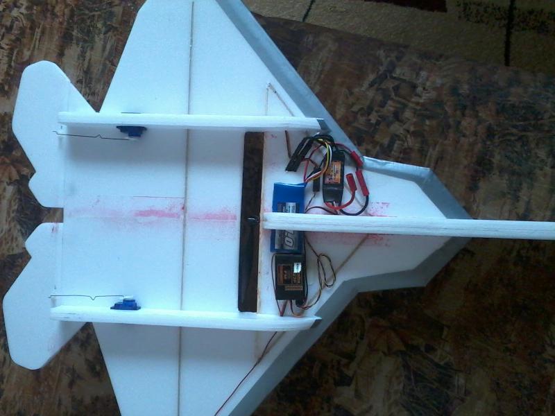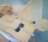 Технология как у Стива Шуматэ, только в пропорции больше в два раза, ну и толщина пенопласта 12мм. Сверху обтянул тонким стеклом, кромки рулей усилил бальзой. Крыло разъемное, на алюминиевой трубе 18мм. Внутри организовал канал для импеллера. Машинки прятал в крыльях и рулях направления. Навеска рулей на нейлоне. Цельноповоротные элевоны на алюминиевых прутках диаметром 8мм.