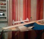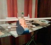 В отличии от оригинала крыло модели выполнено переклейкой 4 листов потолочки (усилено карбоновой трубкой) .Затем Владимир вышкурил сухариком некое подобие профиля крыла(типа плоско-выпуклое ну захотелось ему так-говорит хату пылесосил потом долго а шкурир 3 часа 😃).При вклейки стабилизатор стал смотреть вверх-мы так поняли что эффект возник именно из-за профильности крыла.После триммирования РВ был отклонен градусов на 25 !!! Правда-правда.Пилот сейчас аккуратно вырезал стаб и будет убирать дефект.