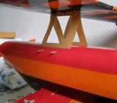 нижняя часть стойки вставляется в пазы на фюзе, сначала хотел вклеивать, потом оставил съемным: в половинках стойки засверлил по два отверстия и два в фюзе - сквозь них пропускаю опять-же отрезки шампуров (см. фото)