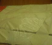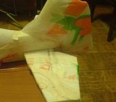 Красим из балончиков аэрозолью в три цвета: синий, рыжий и жёлтый. Раскраску срисовали с нашего второго Яка, который от ричмодель с 72 саитой, размахом 1320мм. Сначала нарисовали фломастером контуры рисунка. Затем, с помощью полиэтиленовых пакетиков из магазина и бумажного скотча заклеили як так, чтобы места на рисунке, где должен быть красный цвет, остались незаклеенными; т.е. заклеили всё, кроме тех мест, где должен быть красный цвет.