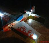 На счёт подсветки, не замечал чтобы меня слепило, хотя в хвосте стоят вертикально врезанные плоские сверх яркае светодиоды. Разноцветная подсветка смотрится действительно здорово. Но обязательно надо подсвечивать изнутри и фюзеляж, иначе, очень сложно определить пространственное положение модельки буквально в 20-30 метрах (это если ночью пробовать летать).