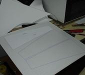 Весь процесс на фото. Трафарет при переносе, ориентировать передней кромкой вдоль линии большей гибкости плитки. Определяеся экспериментально. Ширина отступа между передними кромками перенесенных на потолочку консолей - примерно 10 мм. Канавка - примерно на 1/2 или 3/4 толщины плитки. “Лонжерон” - карбон 500 х 5 х 1 утопленный в паз прорезанный в “пене” на половину толщины плитки и немного “развернутый” той-же ручкой.