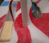 Трещины две, обе по левому борту. Не понятно в какой момент они образовались. Фото с облета. Ветер сегодня был совсем не для полетов, отлетал одну батарею, в полгаза самолет стоял на месте против ветра. Посадка нормально, практически штатно, за исключением момента, что слойка садилась стоя на месте, плавно вертикально снижаясь на брюхо. Собрался летать второй акк, обнаружилось отслоение моторамы, причем не по местам склейки, а расслоилась потолочка. Залил циакрином но летать не стал, обнаружил те самые трещины.