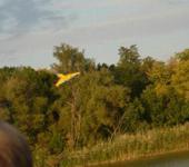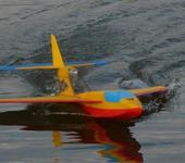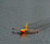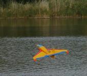 Взлетел 3-4 раза с рук. Водоема и площадки подходящей рядом нет. С рук взлетает очень уверенно - небольшая просадка, дальше при наборе скорости к управляемости и устойчивости претензий нет, аппарат оч. даже “верткий” особенно по каналу элеронов. Без порблем делает бочки, петли, на вертикале скорость теряет не сильно (тяга немногим более 1). Летать с мах. скоростью не оч. комфортно - 3-4 сек. без маневра и он уже далеко… Управляется достаточно хорошо во всем диапазоне скоростей, но чувствительность рулей заметно меняется от скорости (обдува).