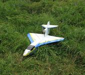 Размеры увеличены до 120%, а размах до 150%. Вместо 6мм трубки-лонжерона, в крыле, вклеена 4мм трубка. В полете ,за счет тонкой трубки, крыло выгибается на несколько градусов .Получается некое подобие V. Дополнительные вертикальные плоскости от крыльев к стабилизатору ,кроме увеличения жесткости оперения,еще отчасти и оттягивают момент срыва потока с крыла.