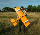 Погодка нынче удалась, и поэтому вечер мы провели в поле. Я конечно своего новенького “погулять вывел” . Пропеллер взял шагом побольше, и как оказалось не зря. Повадки ,и вообще поведение аппарата после обтяжки, особо не изменилось . Летает неплохо, и вообщем-то как и положено крупному самолётке, довольно вальяжно и весьма уверенно. В пилотировании прост и удобен. Без каких либо несуразностей в поведении. На предельно малой скорости никуда не валиться и устойчиво парашутирует. Диапазон скоростей от “пешком” до “достаточно быстро”. Пропеллер шаговитей пригодился явно, сейчас вот на 10х7 апц летал.Не пилотажка конечно , и не фан в чистом виде, но собственно и задача такая была. Леталка интересных и несколько необычных форм. Вообщем я удовлетворён получившимся изделием и конечно уже обдумываю дальнейшие свои действия в строительстве , уже других аппаратов тяжелее воздуха. А этот проэкт будет доведён до завершения и самолётка ещё полетает и порадует зрителей и пилота.