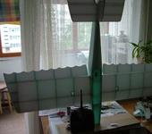 Впечатления. Летает. Вязко и неповоротливо. Управление срабатывает как-бы с задержкой . Хотя вроде вертиться нормально. После метровой пилотажки (летает как ошпаренная), на этом приборе можно совсем расслабиться. Мощности не избыток ,но с места на вертикаль можно. Да, маловато руля направления, расходики добавить надобно, механически. Вообщем получилось , что получилось. НЕЧТО. Для полетушек-показушек самое ОНО, только вот антуражу надо навесить и отделочку душевную произвести. В полёте на малой высоте должно красиво смотреться. Да, вопрос, колёсья хочу по типу велосипедных , да диаметром 110мм, может где встречались кому ?