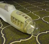 Идея приспособить на “нос” бутылку, по-моему, правильная. Но идея убрать из-под бутылки пену, я думаю, неправильная. Особенно, учитывая, что бутылка, как я понимаю, не сплошная, а набрана фрагментами. Модель-то не стендовая. Будет иногда носом в землю приходить. А там еще и аккумулятор в носу. Кстати, самое время спросить: расскажите, что получается с центровкой?