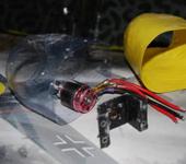 Капот у мессера тоже довольно быстро пришел в негодность, пришлось его срезать, тут -то и пригодился заранее сделаный капот из бутылки. (кстати, один еще где-то по закромам валяется). Перпендикелярно оси мотора приклеил к фюзеляжу 5-мм толщины пластину из пластика, с отверстиями пра проводов и четырьмя саморезами к ней прикрутил выгнутую из оцинкованной железной пластинки лавочку - подставки под мотор.подставку под мотор. Ширина пластинки примерно 25 мм. Подгибая лавочке нужную ногу на глаз делал небольшой выкос. Крепости у конструкции достаточно, чтобы держа самолет за вал мотора им можно было помахивать в воздухе. За год при неизбежных крашах пластина отрывалась, ножки у жестяной моторами подгибались от морковок, при этом все всегда восстанавливал на глазок, и самолет отлично, уверено летал и управлялся.