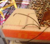 Обязательно концы проволоки, которые будут вставляться в пенопласт, необходимо зачистить (сделать насечку) пассатижами. Затем нужно намотать на них нитки и слегка прихватить циакрином. Затем все это дело вставляем внатяг в пенопласт и капаем циакрином. За счет ниток костыль держится отлично. Вырвать не реально.