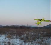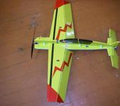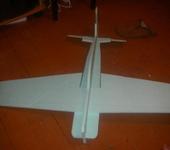 Взлётный вес - 850г. Движок dualsky 4240, тяга 1540г, тяговооружённость 1,8. Материалы - пенопласт, алюминий (лонжерон), скотч. Рисунок - это просто черный + оранжевый скотч. Профиля, как такового, нет - плоское крыло. Толщина крыла 8 мм. Фюз в носу - 25мм, к хвосту - 6мм. Вдоль всего фюзеляжа стрингер, или лонжерон? короче, ребро жёсткости из дюраля ( половинка распиленного лобзиком вдоль дюралевого уголка 15х15 мм.). Вторая половинка этого уголка пошла в качестве лонжерона в крыло, понятно, что упиленная до 8мм. Тоже самое на стабилизаторе и киле. Решение - копеечное в сравнении с углём, прочность выше. Сломать нельзя, можно только согнуть. Моторама - П-образная из дюралевой пластины 20х2мм. При нескольких вертикальных втыканиях в землю страдала только она - гнулась. Выгибали плоскогубцами, меняли сломанный винт, летели дальше. Пробовали, в качестве эксперимента, на этом самолёте и симметричный фан-флаевский профиль - особо ощутимой разницы я не почувствовал.😃