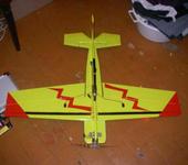 Взлётный вес - 850г. Движок dualsky 4240, тяга 1540г, тяговооружённость 1,8. Материалы - пенопласт, алюминий (лонжерон), скотч. Рисунок - это просто черный + оранжевый скотч. Профиля, как такового, нет - плоское крыло. Толщина крыла 8 мм. Фюз в носу - 25мм, к хвосту - 6мм. Вдоль всего фюзеляжа стрингер, или лонжерон? короче, ребро жёсткости из дюраля ( половинка распиленного лобзиком вдоль дюралевого уголка 15х15 мм.). Вторая половинка этого уголка пошла в качестве лонжерона в крыло, понятно, что упиленная до 8мм. Тоже самое на стабилизаторе и киле. Решение - копеечное в сравнении с углём, прочность выше. Сломать нельзя, можно только согнуть. Моторама - П-образная из дюралевой пластины 20х2мм. При нескольких вертикальных втыканиях в землю страдала только она - гнулась. Выгибали плоскогубцами, меняли сломанный винт, летели дальше. Пробовали, в качестве эксперимента, на этом самолёте и симметричный фан-флаевский профиль - особо ощутимой разницы я не почувствовал.😃