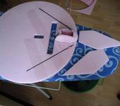 Потребность в такой штучке возникла не случайно – зима, темнеет рано. Днём не всегда получается полетать, а летать хочется. А вот чего не хочется, так это тратить много времени на постройку очередного летательного аппарата. Плосколётов-пенолётов к этому моменту уже было построено немало, технология их постройки была более-менее отлажена, поведение в воздухе тоже вроде известно. Но хотелось чего-то такого маленького, бесплатного (т.е. с использованием уже имеющейся комплектации), травмобезопасного, и быстрого в приготовлении. А что мы знаем такого быстрого в приготовлении? Конечно, блины!😁 Вот блинчик и решено было делать. Блинчики я уже делал, немножко другой конструкции (предыдущий был побольше, тоже с подсветкой, его фотки и видео с ним довольно долго висели на сайте космопоиска в виде новогоднего прикола, в прошлом году). Из имеющихся материалов, которые было не жалко, завалялся у меня 20мм лист пенопласта. Его и было решено оприходовать. Разрезал его струной наискосок на две равные половинки, одну отложил (потом была отдана приятелю – ему тоже блинчиков захотелось), на второй от руки нарисовал некую каблуко-подобную фигуру и обрезал по контуру. Именно каблуко-подобную, а не круг, т.к. на задней кромке хотелось выделить побольше места под рули. Тем более, что хотелось предусмотреть возможность установки гироскопа в канал крена, а это предполагает наличие отдельного руля высоты, и отдельных элеронов. Очень не хотелось использовать две машинки на элероны, отсюда такая, казалось бы, немного вычурная система тяг на элероны и непропорционально маленький руль высоты, зажатый между элеронами. Было маленькое опасение, что руля высоты может не хватить. Правда, был и ещё такой расчёт: хоть по размаху руль высоты и коротковат, зато у него приличная хорда – 11см, и расходы будь здоров – туда/сюда на 45 градусов, да плюс он в постоянном обдуве.