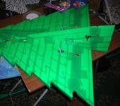 Решение сделать летающую ёлку пришло спонтанно. Предложил сын, добавив, что если надо, всё снимет на видео и смонтирует (что потом и исполнил). Подумал – а почему бы и нет? Ведь в конце концов, ёлка – это треугольник, треугольник – это дельталёт, который, в свою очередь, приходится родственником летающим крыльям и блинчикам, а то и другое я уже неоднократно делал. Решено. Что было на тот момент свободного? Машинки HS-55, пилотажевский движок DT3007, регулятор на 25А. Пойдёт. 20мм лист пенопласта ПС-35. Сгодится. Ну, зелёный скотч, дюралевый уголок, понятное дело, есть всегда. За дело. Пенопласт, как был пластиной, так и оставил, нарезал на нём зубчатую имитацию еловых веток. Вроде получилось. Вклеил мотораму, обтянул, навесил рули, поставил киль. На всё ушёл день.