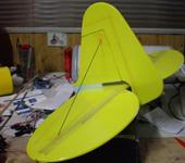 Все плоскости - из одного слоя ТЕПЛОНА 5мм. По передней кромке стабилизатора и в руль направления для жесткости вклеены реечки нарезанные из линейки. Половинки руля высоты соединены карбоновой трубочкой диам. 5мм. Расчалки из карбонового прутка 1мм. В местах крепления кабанчиков и расчалок вклеены площадочки из плотной бальзы. Руль высоты навесил на армированный скотч, а РН на майларовые петли.