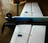 По полету - пока ничего конкретного сказать не могу. Был порывистый ветер да и холодно у нас сегодня. Модель при весе в 440гр. летает как пушинка. Инвертный полет без вмешательства руля высоты. Отклонения рулевых плоскостей от стандартных качалок серв HXT 900 для меня более, чем достаточно. В ветер модель показалась дерганной - но уже не стал настраивать двойные расходы. Понравилась эффективность элеронов. Модель висит легко.
