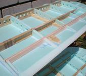 Верх будет зашиваться потолочкой 3.5мм. Так как консоль имеет длинну 1 метр, а лист потолочки 50см, на месте стыка листов будет стоять двойная по толщине нервюра. Перед зашивкой крыла так-же будут вклеены фанерные площадки для крепления серв, подкосов, кабанчиков. Элерон будет отрезаться уже от готовой консоли…