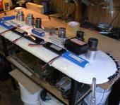 В качестве стапеля для сборки крыла использовал толстую ровную фанеру, вырезанную по ширине крыла. Клеил разведенным титаном, иначе не успевал нанести клей на все кромки, лонжероны и нервюры. После нанесения клея накладывал верхнюю обшивку и плотно приматывал бумажным скотчем прямо к стапелю. Сверу еще подгрузил балластом всяким, дабы обшивка прилегла ко всем переборкам.