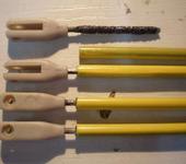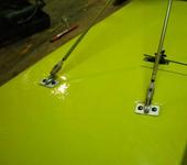 Сами подкосы из угольной трубочки диам. 4мм., снаружи обклеил их желтой изолентой ( пожадничал термоусадку 😁). На концах вклеены кусочки велосипедной спицы, с одной стороны с резьбовой частью, с другой Г -образные загогулины. Дабы спицы нормально и плотненько входили в трубку, обмотал их ниткой с пропиткой циакрином. На циакрине их же и вклеил. На резьбовую часть навинчиваются пластиковые вилки, таким образом можно регулировать длинну подкоса в пределах ± 5мм.