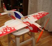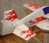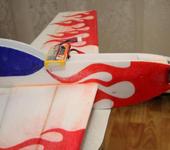 Вы оказались правы, вечером спаял всю начинку, установил, спустился в магазин на весы, с незаклеенным верхом и низом полный вес составил 210 грамм. Прикинул расвесовку: акк 48 г, мотор 38 г, рег 9 г, планер с сервами и тягами 115 г. ЦТ в районе 65 мм получился при таком размещении акка, как на фото. Эх, акк с мотором другой бы… Закажу, а пока паз под акк резать не буду, сбоку приделаю на липучку или еще как-нибудь, облетать охота. Материал изготовления - теплон 3 мм, все усиления - линейка, навеска РН - дискета, остальное на скотч. Раскраску нагло стырил, понравилась больно, красил спиртовыми маркерами, но после этого надо однозначно аквалаком или лаком для волос покрывать, смазывается пальцами, на фото видно. Проверил тягу - при 50 % стика равна 1, удерживая самик в руках тянет вниз и влево. Наверное надо делать выкос или так попробовать облетать, акк на правый борт и оттриммировать?