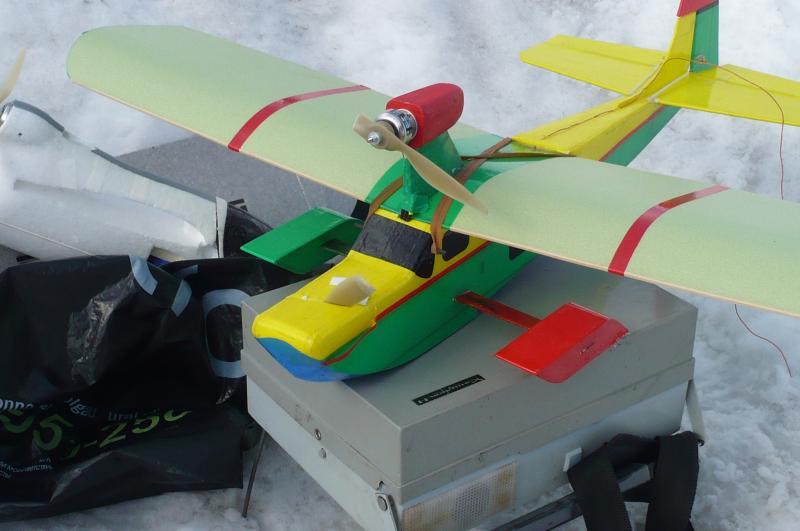 Харакири по пенсионерски. Сегодня с удовольствием полетал, но крайний раз взлетая словил боковой порыв ветра, результат на фото.😮 Обычно крепил крыло на 4 резинки, а сегодня расслабился и летал на двух, винтк 8х4 Е аккуратненькопрорубил три щелки на мордочке.😒